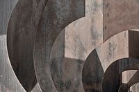 Tijdens een bezoek aan Genk, België, kwam ik metalen kunstwerk tegen. Het metaal is door weersinvloeden fraai verweerd. De zon werpt grillige schaduwen op het de halve cirkels. Tijdens de nabewerking heb ik naar eigen inzicht de kleuren aangepast.