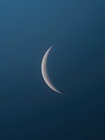 Teleshot van de halve maan tijdens het blauwe uur. De jonge maansikkel tijdens het eerste kwartier. Astrofotografie geschoten met een lange sluitertijd.