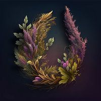 Een sierlijk, halvemaanvormig arrangement van delicate bloemen en bladeren tegen een donkere achtergrond. De compositie in rijke tinten paars, groen en goud combineert botanische elegantie met een vleugje hemelse charme. Ideaal om een geraffineerd en harmonieus accent toe te voegen aan elk interieur of ontwerpproject.