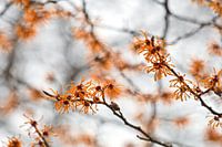Hamamelis, oftewel toverhazelaar, is een bloeiende struik van januari tot in maart. De typische spinachtige bloemen bloeien aan de kale takken. Gefotografeerd tegen de lucht geeft een netwerk van onscherpe takken op de achtergrond die mooi over het beeld zijn verdeeld.