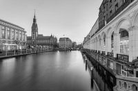 Zwart-witte versie van het stadhuis van Hamburg met de Alster arcades gezien vanaf de Jungfernstieg.