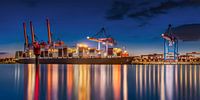 Containerterminal in de industriehaven van Hamburg aan de Elbe. Grote kranen laden containers op een containerschip. Sfeervol havengezicht van Hamburg in de avond op het blauwe uur.