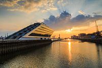 Het Dockland ontspringt van de Elbe in de haven van Hamburg Gouden, warme licht wordt weerspiegeld en betovert de haven