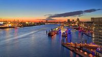 Avondgrijs in de haven van Hamburg, een prachtig schouwspel dat me altijd weer in verrukking brengt. De zon gaat onder en de stad en de haven van Hamburg baden in een heel zacht licht.