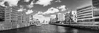 Omgebouwde pakhuizen in de wijk Hafencity in de stad Hamburg in Duitsland tijdens een mooie zomerdag. Uitzicht vanaf de Mahatma-Gandhi-Brücke. Zwart-wit panoramafoto.