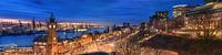 Hamburgse haven met Landungsbrücken en Hotel Hafen Hamburg in de sfeervolle zonsondergang. Extra brede XXL panoramafoto 410007ays