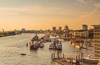 De avondzon schijnt op de steigers en over de Elbe. Het uitzicht op de haven en de stadshaven maakt het plaatje compleet.