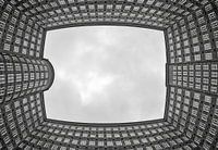 Zicht naar boven op de binnenplaats van het Sprinkenhof-gebouw in de Hamburgse wijk Stad en Kontorhaus als zwart-witfoto.