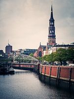 Uitzicht over het Hamburgse douanekanaal naar de Hauptkirche St. Katharinen uit de 13e eeuw.