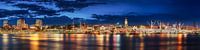 Panoramisch uitzicht over de Elbe tot aan de skyline met de oude Elbtunnel, Reeperbahn, Landungsbrücken en Michel.