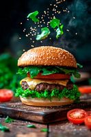 Een sappige burger ontvouwt zich in al zijn pracht: het gouden sesamzaadbroodje omarmt perfect gegrild vlees, verse groenten en smeltende kaas. Aromatische dampen stijgen op, terwijl knapperige plakjes tomaat en helder groen voor een smakelijk contrast zorgen. Dit culinaire kunstwerk brengt levendige kleuren en een uitnodigende sfeer in…