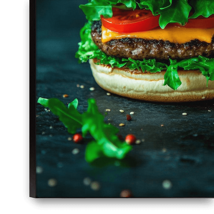 Een sappige hamburger met gesmolten kaas en verse groenten wordt omhuld door geurige rookwolken, terwijl de knapperige slablaadjes zachtjes dansen in de lucht. Deze smakelijke compositie geeft een gevoel van verwennerij en gezelligheid. Perfect voor de keuken of eetkamer, waar koken en smullen centraal staan.
