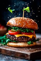Sappige laagjes komen samen onder een goudbruin broodje, terwijl verse groenten en levendige plakjes tomaat zorgen voor een smakelijk vleugje kleur. De gesmolten kaas en malse hamburger maken dit meesterwerk helemaal af. Dit culinaire kunstwerk vindt zijn perfecte plaats in de keuken, waar het symbool staat voor perfecte verwennerij.