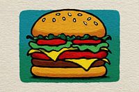 Details: hamburger, voedsel schilderij, broodje, tomaat, sla, kaas, groen, bruin, geel, blauw