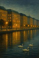 Dit betoverende en serene schilderij vangt de stille magie van de Hamburgse Binnenalster in de schemering. De scène wordt gedomineerd door het diepe, rustgevende blauw van het water en de avondlucht, waardoor een koele, sfeervolle achtergrond ontstaat voor de warme, gloeiende lichten van de stad. Een rij elegante, historische gebouwen -…