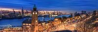 De haven van Hamburg met de Landungsbrücken als panorama in de sfeervolle zonsondergang.