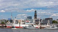 Hamburgse havenscène met het museumschip Cap San Diego aan de steigers en de Hamburgse Michel op de achtergrond