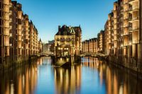 De waterburcht in de Speicherstadt in Hamburg is een zeer populaire bestemming en is vooral bekend bij theeliefhebbers, omdat het een theesalon en café bevat waar geselecteerde thee kan worden geproefd en gekocht. Na zonsondergang ontsteekt de verlichting van de gebouwen de hele schoonheid van deze unieke locatie.