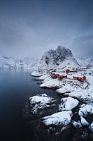 De voor het land typische rode huizen bieden een prachtig kleurcontrast met het koude blauw van de winterschemering. Gefotografeerd in hoge resolutie en met veel kennis van zaken afgedrukt, komt een stukje Noord-Noorwegen aan uw eigen vier muren!