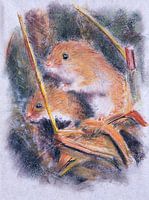 Pastel op papier. Twee goudhamsters zoals ze horen te zijn: in de natuur. Nestje gebouwd, zoekend naar eten.
