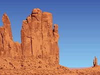 Het digitale kunstwerk toont een zonovergoten tafereel van Monument Valley, gelegen in de woestijnachtige grensstreek tussen Arizona en Utah. Onder een strakblauwe zomerlucht zonder enige wolken, ontvouwt zich een imposant landschap dat tegelijk tijdloos en buitenaards oogt. Op de voorgrond domineert een monumentale zandsteenformatie het beeld – dit is de “Hand of God”, een iconische rots die met zijn opgestoken ‘vingers’ als een mystieke wachter uit de aarde lijkt op te rijzen. Zijn diepe schaduwen en warme, roodbruine kleuren contrasteren krachtig met het koele blauw van de lucht erboven.