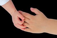 Hand van pasgeboren baby in contact met hand van kind, geisoleerd op een zwarte achtergrond. Hand van familie raakt elkaar aan. Kleine en grotere hand van baby en jong kindje.