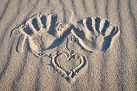 Handafdrukken in het zand op het strand van de Baltische Zee. Handen en hart