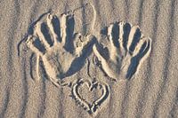 Handafdrukken in het zand op het strand van de Baltische Zee. Handen en hart
