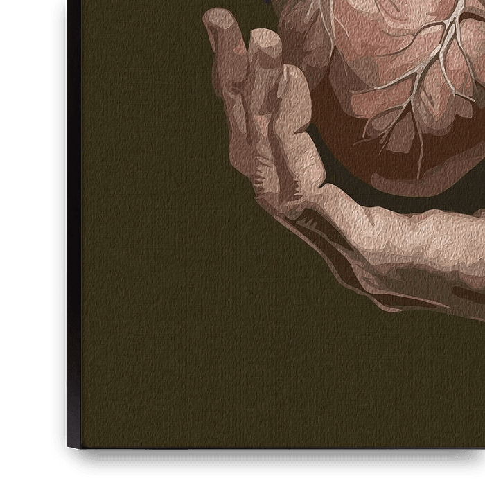 Een krachtige afbeelding van twee handen die delicaat een menselijk hart vasthouden. Dit realistische kunstwerk verbeeldt thema's als kwetsbaarheid, leven en verbinding, waardoor het een boeiend middelpunt vormt voor moderne interieurs. Ideaal voor prints op canvas, metaal of hout.