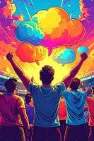 Een kleurrijke, gestileerde afbeelding van mensen die hun handen samen opsteken om iets te vieren of om zich te verenigen.