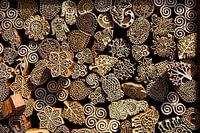 Blokdrukstempeltjes oorspronkelijk gebruikt om katoen te bedrukken, maar ook te gebruiken op papier. Het stempelpatroon is wit geschilderd, zodat het patroon goed zichtbaar is en de stempels ook een decoratieve waarde hebben.
