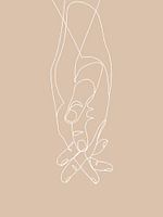 One-line illustratie van handen op een beige achtergrond.