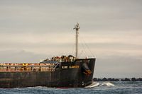 De bulkcarrier vaart de Nieuwe Waterweg op. De blokkenlijn van de pier van Hoek van Holland, De zeeman aan dek. De menieplekken op de dekluiken de sporen roest op de romp van het zeeschip. De ankerwinches op de voordek het anker op de boeg. Er zijn zo veel details te ontdekken op foto van een zeeschip.