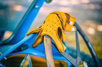 Rijhandschoenen op het stuur van een Bugatti Type 43-klassieker uit de jaren twintig van de vorige eeuw. Detail opname met een beperkte scherpte diepte en vintage sfeer.