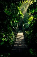 Een smal, zwevend houten pad snijdt door het dichte groen van het regenwoud en wordt op mysterieuze wijze doorkruist door zachte lichtstralen. Het weelderige gebladerte omlijst de brug, die eruitziet als de drempel naar een verborgen avontuur. Hier, tussen licht en schaduw, wacht de natuur om ontdekt te worden.