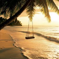 Zachte golven omspoelen het gouden zand, terwijl de avondzon de hemel in een warm licht baadt. Een wiegende hangmat, zachtjes vastgehouden door een palmboom, nodigt je uit om te dromen en te ontspannen. Hier komen natuur en rust samen in perfecte harmonie - een idyllisch toevluchtsoord dat de ziel kalmeert en je het alledaagse leven laat vergeten.