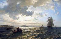 Een schip, een zeilschip, komt vol in zeil voorbij over zee aan de kust van Noorwegen terwijl het licht van de zon weerspiegelt op de golven van het water. Voor zitten vissers in hun boten.
