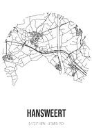 Zwart-witte landkaart, stratenplan of plattegrond van Hansweert. Hansweert is gelegen in de gemeente Reimerswaal, provincie Zeeland. Op de stadskaart zijn alle openbare wegen in Hansweert opgenomen. Verder is de kaart voorzien van de coördinaten van het centrum van Hansweert.
