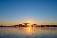 Hanzeboog treinbrug over de rivier de IJssel bij Zwolle tijdens een koude winterochtend in Nederland. Het waterpeil is hoog en er ligt sneeuw en ijs op de dijken aan de oever van de rivier tijdens deze mooie ochtendzonsopgang.