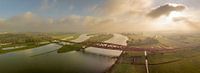 Hanzeboog treinbrug over de IJssel bij de stad Zwolle in Overijssel, Nederland. Vanaf boven met een drone gezien. Wijds panorama beeld met schilderachtig licht.