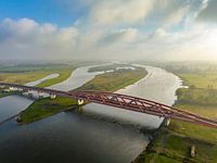 Hanzeboog treinbrug over de IJssel bij de stad Zwolle in Overijssel, Nederland. Vanuit een drone gezien.