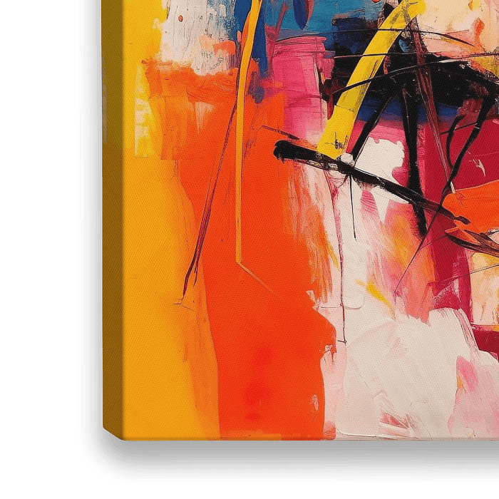 Abstract kunstwerk met levendige kleuren en dynamische vormen die typisch zijn voor moderne kunst. Het is een explosie van kleur, waar elke penseelstreek bijdraagt aan een gevoel van beweging en energie.