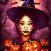 Digitaal schilderij van een vriendelijk ogende heks omringd door pompoenen en vleermuizen, geheel in de stijl waar Halloween wereldwijd bekend om is.