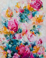 Een explosie van bloemen! Dit schilderij stort zomerse vrolijkheid over je uit. Zie een weelderig kleurrijk boeket, dartelende vlinders, zonlicht, zoet geurende bloesems. Een tuin om in rond te dwalen in je fantasie en even te ontsnappen aan je dagelijkse wereld.