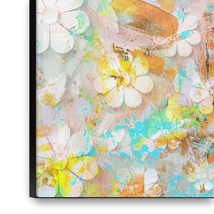 Vrolijke abstracte kunst, mixed media in lente sfeertje met bloemen en geel en turquoise kleuren