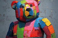 Happy Patchwork Bear - Dit kleurrijke kunstwerk toont een knuffelbeer, die met zijn felle kleuren en grote expressieve ogen een speelse sfeer uitstraalt, ideaal voor moderne kunstliefhebbers.