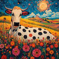 Een kunstwerk van een zwart-wit gevlekte koe te midden van een levendig veld met kleurrijke bloemen met dynamische impasto verfstreken aangebracht. De achtergrond toont glooiende heuvels onder een wervelende sterrenhemel in de stijl van Van Gogh, met een felle zon en een boerderij in de verte, wat een vrolijk en pittoresk landelijk tafereel creëert.