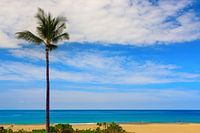 Een vroege zondagochtend bij Hapuna Beach State Park, een eenzame surfer wachtend op golven om misschien te kunnen surfen. Hapuna Beach ligt op The Big Island, het grootste eiland van de Hawaïaanse eilanden.