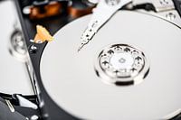Harde schijf met een zichtbare schijf, actuator en spindel. Het geheugen opslag computer onderdeel van de harde schijf is geopend voor reparatie.