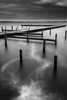 Harde wind aan het Leekstermeer. De foto toont de aanlegsteiger en de paaltjes, waar de wind tussendoor speelt. Foto is in portretstand en in zwart-wit met hoge contrasten. Het Leekstermeer ligt in het natuurgebeid De Onlanden in de provincie Drenthe.